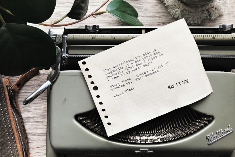 When determining the size or complexity of a new habit ask yourself, “What can I stick to—even on my worst day?” Start there. Master the art of showing up. Then advance. James Clear newsletter Typed on DIY coffee-dyed grid refill paper with my 1950’s Groma Kolibri.