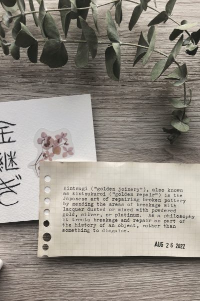 Kintsugi (金継ぎ, “golden joinery”), also known as kintsukuroi (金繕い, “golden repair”), is the Japanese art of repairing broken pottery by mending the areas of breakage with lacquer dusted or mixed with powdered gold, silver, or platinum. As a philosophy, it treats breakage and repair as part of the history of an object, rather than something to disguise. Wikipedia Typed on coffee-dyed…